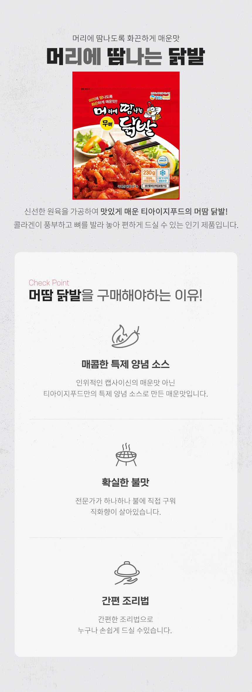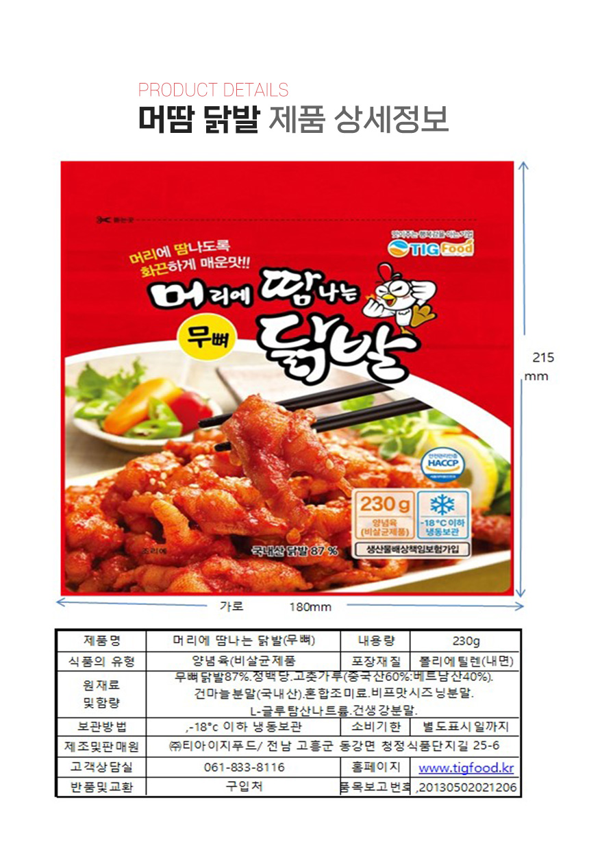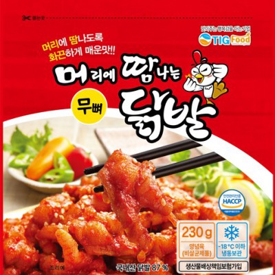 | 원재료명 및 함량 | 닭발(국내산85%,고춧가루3%(중국산),고춧가루3%(베트남산),정백당,건마늘분말,건생강분말,소고기분말향,소고기분말시즈닝,혼합조미료.L-글루탐산 나트륨 |