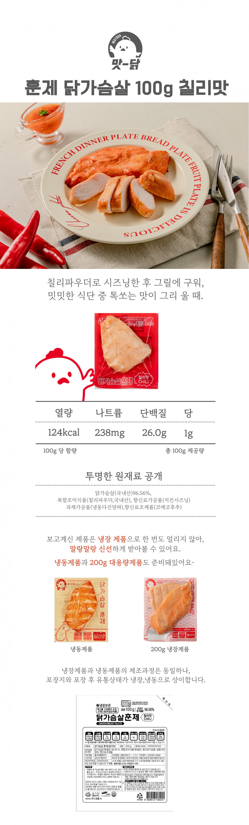 | 원재료명 및 함량 | 닭가슴살96.56%,칠리분말1.5%,바비큐맛시즈닝1.24%,L-글로타민산나트륨,간양파0.5%,백후추 향료 0.2% |