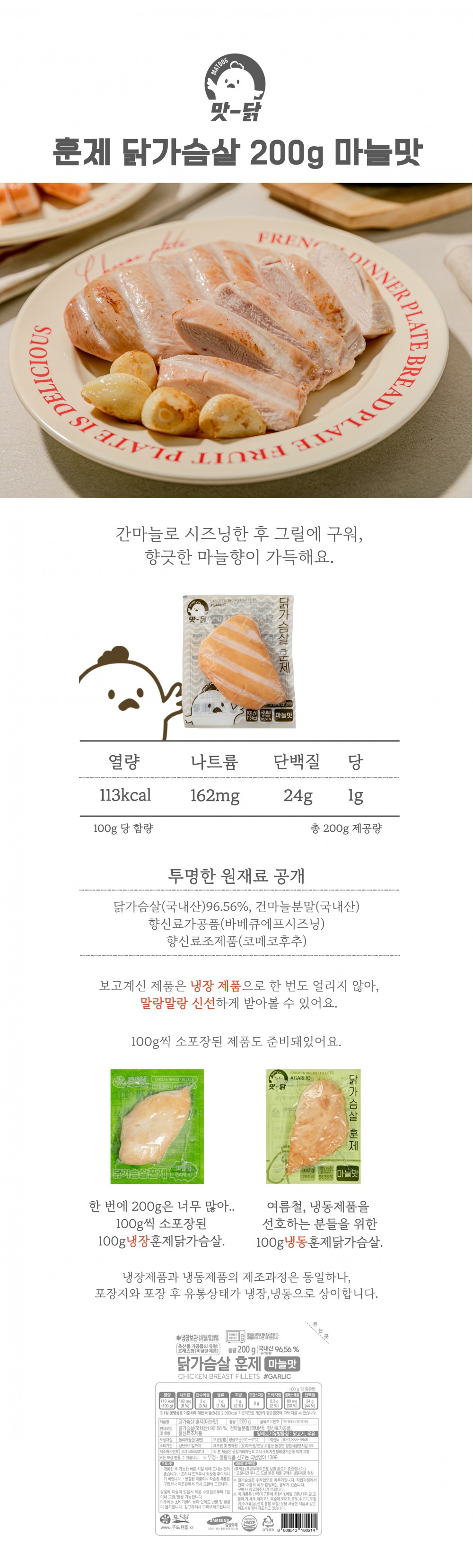 | 원재료명 및 함량 | 닭가슴살 96.56%, 마늘 2.7%, 바비큐시즈닝 0.44%, 건조백후추 0.3% |